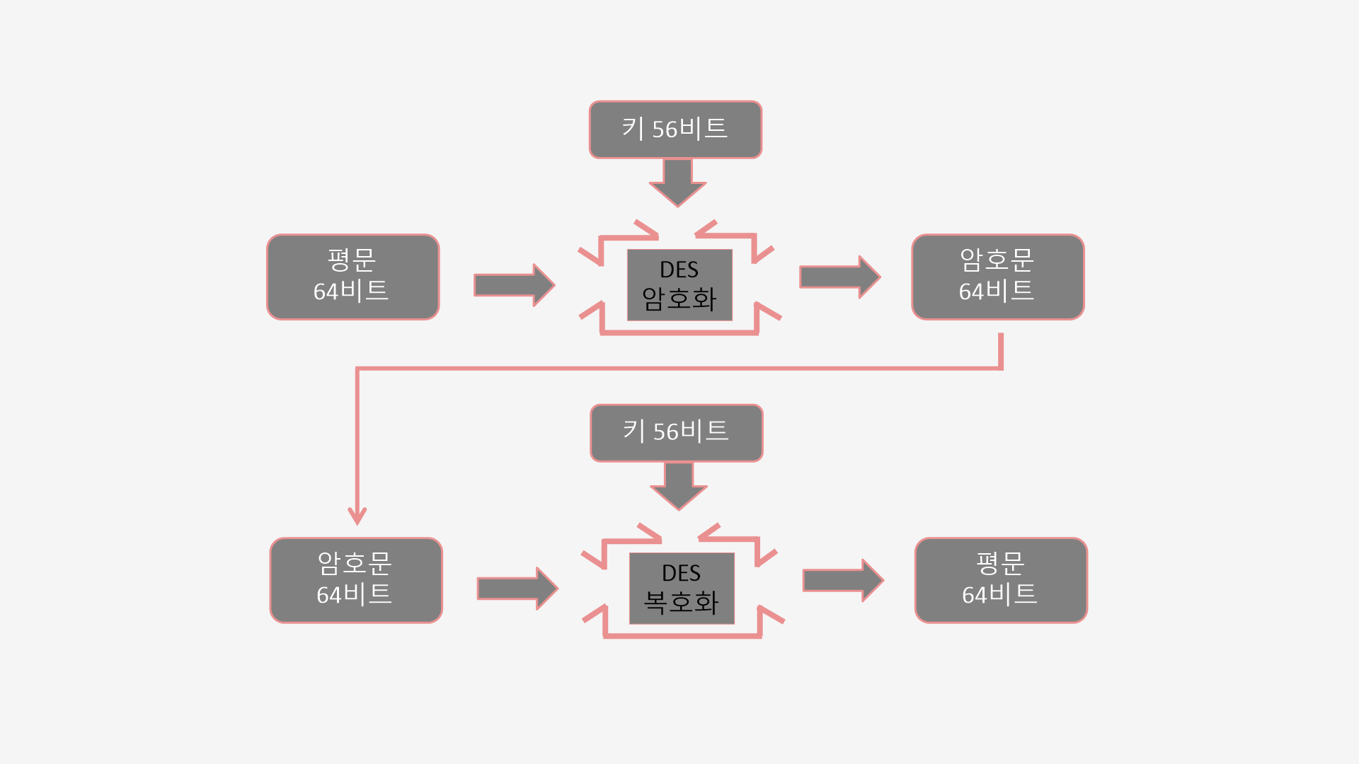 DES는 64비트 평문을 64비트 암호문으로 암호화하는 대칭 암호 알고리즘이야.